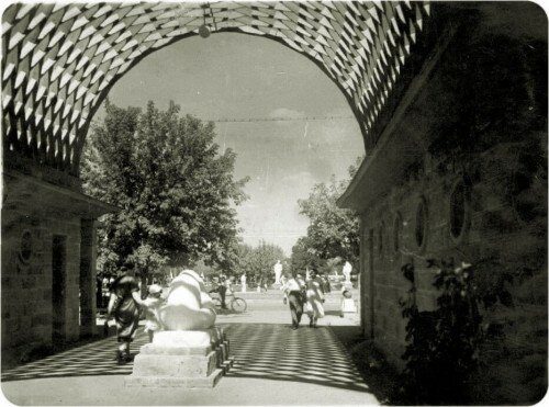 Изначально архитектурное построение дополняла фигура медведицы с медвежонком. Работа архитектора Г. Вегмана 30-х годов, памятник архитектуры Запорожья.